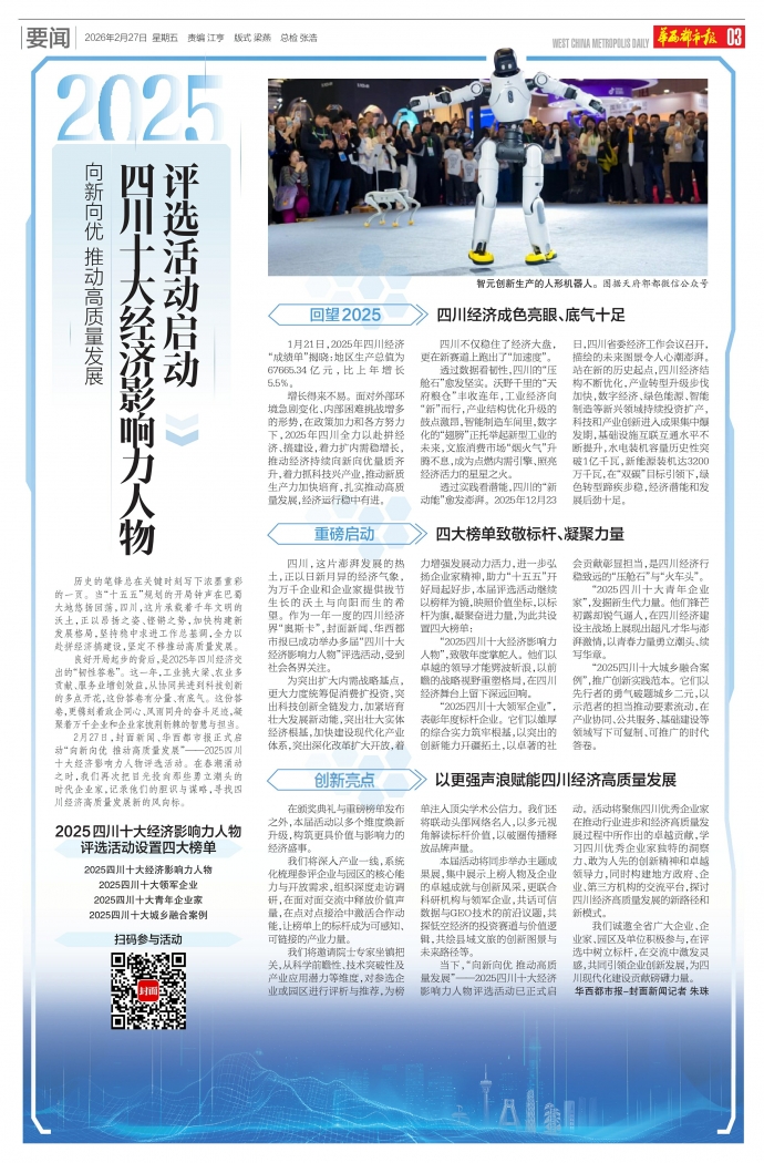 2月27日,封面新闻、华西都市报正式启动“向新向优 推动高质量发展”——2025四川十大经济影响力人物评选活动。在春潮涌动之时,我们再次把目光投向那些勇立潮头的时代企业家,记录他们的胆识与谋略,寻找四川经济高质量发展新的风向标。