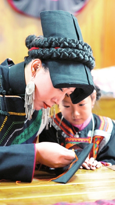 绣娘尼尼阿果在教孩子彝族刺绣。