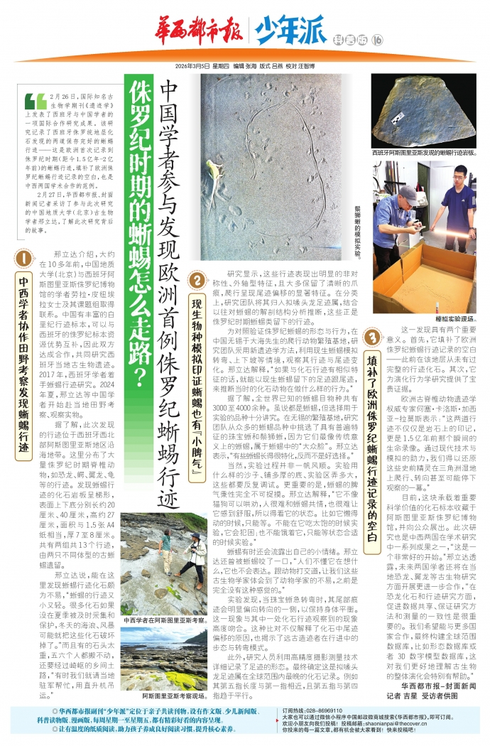 2月26日,国际知名古生物学期刊《遗迹学》上发表了西班牙与中国学者的一项国际合作研究成果。该研究记录了西班牙侏罗统地层化石发现的两道保存完好的蜥蜴行迹——这是欧洲首次记录到侏罗纪时期(距今1.5亿年-2亿年前)的蜥蜴行迹,填补了欧洲侏罗纪蜥蜴行迹记录的空白,也是中西两国学术合作的范例。