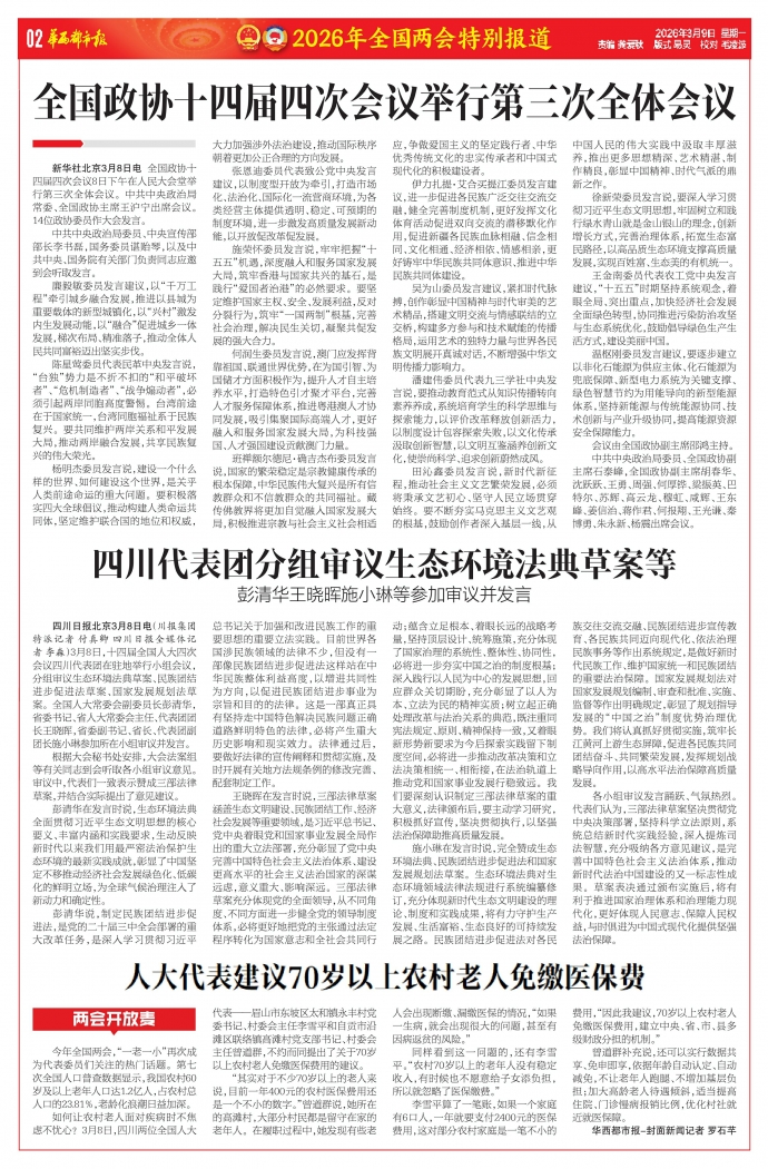 如何让农村老人面对疾病时不焦虑不忧心?3月8日,四川两位全国人大代表——眉山市东坡区太和镇永丰村党委书记、村委会主任李雪平和自贡市沿滩区联络镇高滩村党支部书记、村委会主任曾道群,不约而同提出了关于70岁以上农村老人免缴医保费用的建议。
