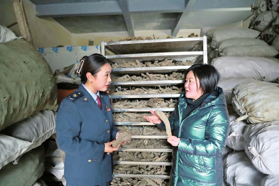 胡晓玲(右)正在和当地工作人员沟通中药种植情况。受访者供图