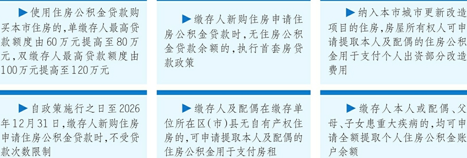 在进一步支持城市更新方面,因房屋征收拆迁使用住房公积金贷款新购住房的,最高贷款额度上浮20%;纳入本市城市更新改造项目的住房,房屋所有权人可申请提取本人及配偶的住房公积金用于支付个人出资部分改造费用。