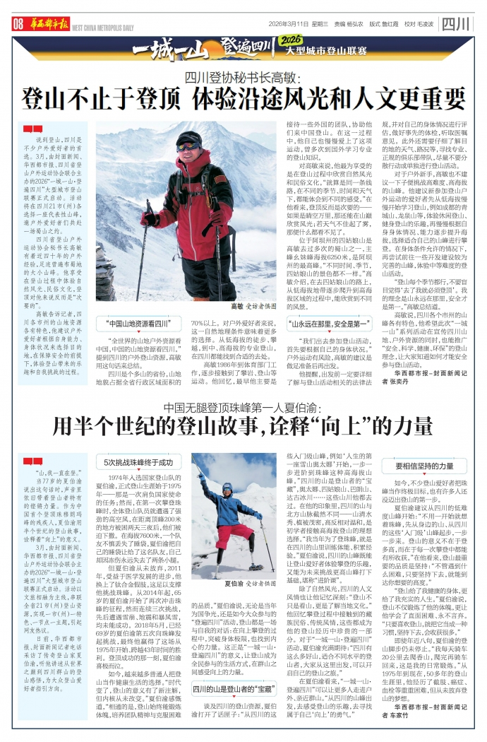 四川省登山户外运动协会秘书长高敏有着近四十年的户外经验,足迹曾遍布蜀地的大小山峰。他享受在登山过程中体验自然风光、民俗文化,登顶对他来说反而是“次要的”。