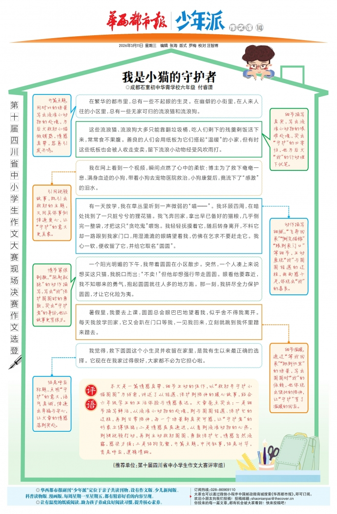 本文是一篇情感真挚、细节生动的佳作,以“救助并守护小猫圆圆”为线索,讲述了从相遇、保护到陪伴的暖心故事,贴合六年级学生的生活体验与情感表达。文章亮点突出:一是细节描写鲜活,从流浪小动物的处境,到与圆圆相遇、保护它的过程,再到日常陪伴,每一个场景都真实可感,让“守护者”的形象立得很稳;二是情感层层递进,从看到流浪动物的心疼,到被视频打动,再到主动救助圆圆、勇敢保护它,情感自然流露,感染力强;三是结构完整,开篇点题,中间叙事,结尾升华,首尾呼应,逻辑清晰。