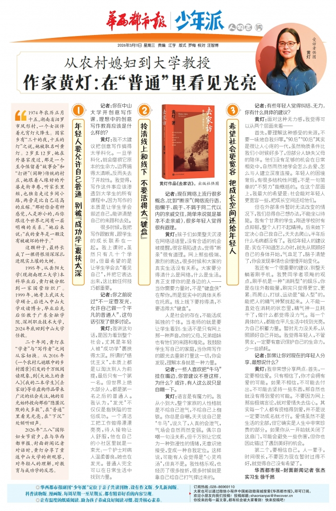 2026年“三八”国际妇女节前夕,在与华西都市报、封面新闻记者对话时,黄灯分享了重返中山大学的新观察,对年轻人的理解,对教育与成功学的反思。