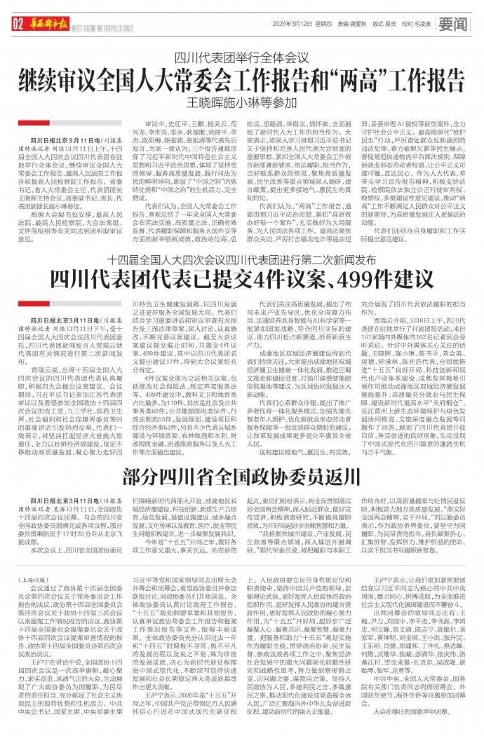 本次会议上,四川省全国政协委员们围绕新时代西部大开发、成渝地区双城经济圈建设、科技创新、新质生产力培育、绿色发展、基础设施建设、城乡融合发展、文化传承以及教育、医疗、就业等民生问题积极建言,进一步凝聚发展共识。