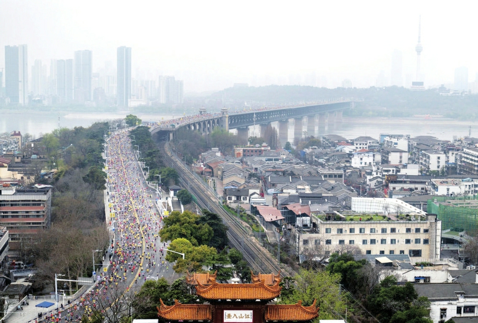 3月22日,2026武汉马拉松参赛选手通过长江大桥。