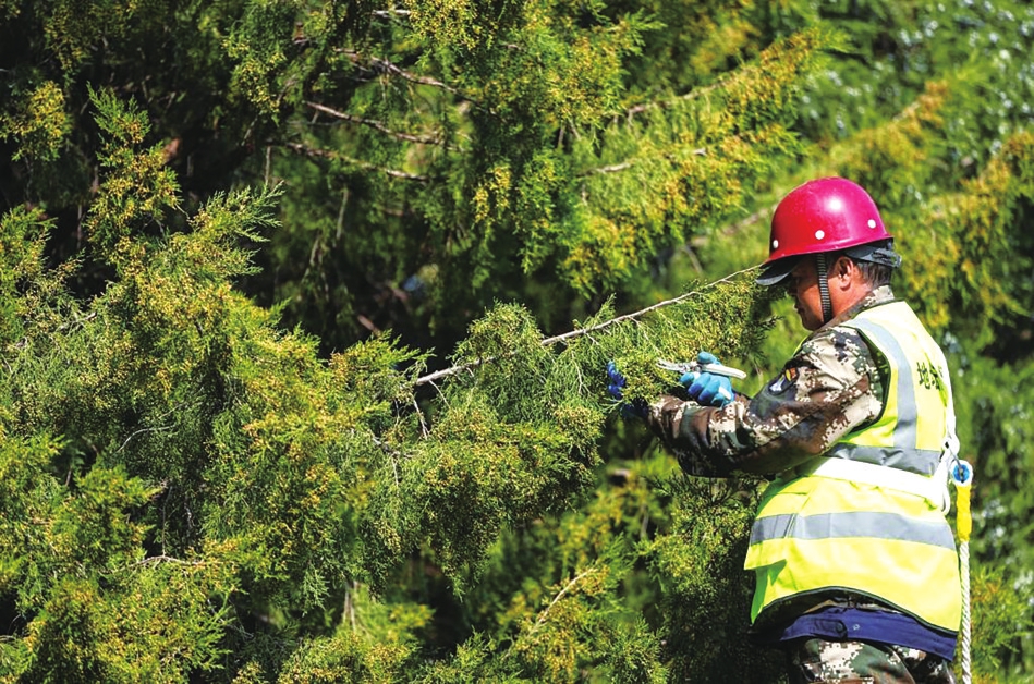 3月15日,在北京地坛公园,工作人员在修剪柏树雄株上的雄球花。