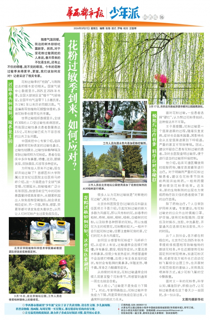 从个人到社会,各方都在积极应对。北京市已在2025年秋冬季提前修剪圆柏等致敏植物的雄球花枝条,并在近期使用花粉固定剂对树冠喷淋,加速花粉沉降;成都等南方城市也已启动花粉飞絮综合治理工作,在开展树木规范修剪的基础上,采用高压喷淋等方式,减少花粉飞絮的空中飘散量。