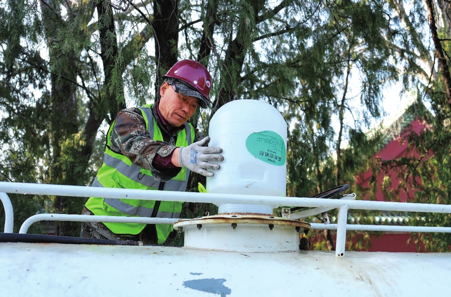 工作人员向洒水车内添加花粉控制剂。