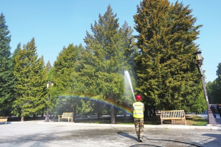 工作人员在北京地坛公园使用添加了花粉控制剂的水对柏树进行喷淋。