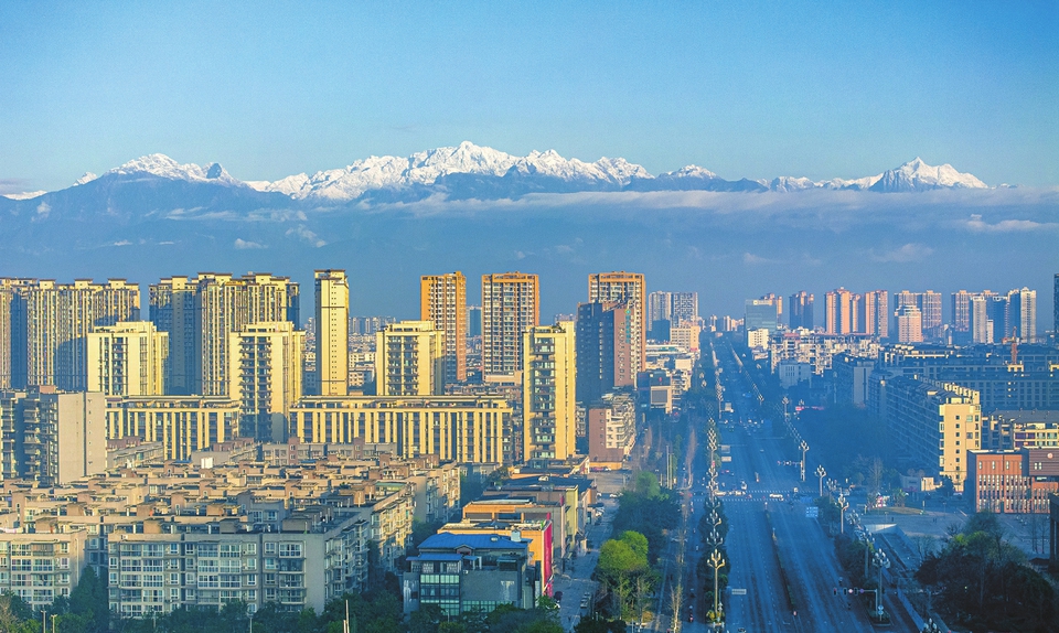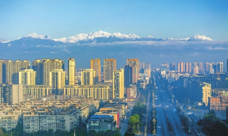 天气好时,从德阳市区往西远眺,远处海拔4989米的龙门山脉最高峰——狮子王峰,阳光正洒向山顶,将积雪照得金黄。