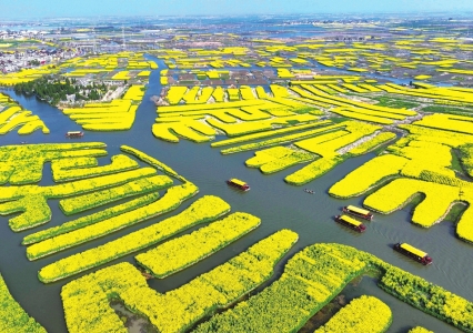 3月29日,游客在江苏省兴化市千垛景区赏花游玩。