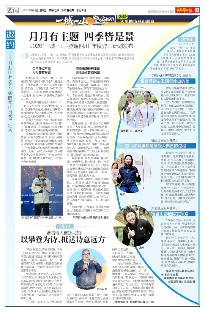 “登山的意义,不在于征服,而在于以谦卑之心与山相望,在攀登中完成自我超越,抵达自然与精神的双重高地。”3月31日,2026“一城一山·登遍四川”大型城市登山联赛启动仪式暨什邡市龙门之巅全域徒步大会在德阳什邡举行。