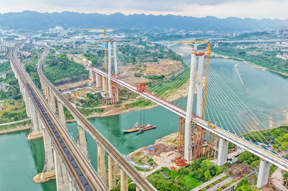这是3月30日拍摄的成渝中线高铁井口嘉陵江特大桥建设现场。新华社发
