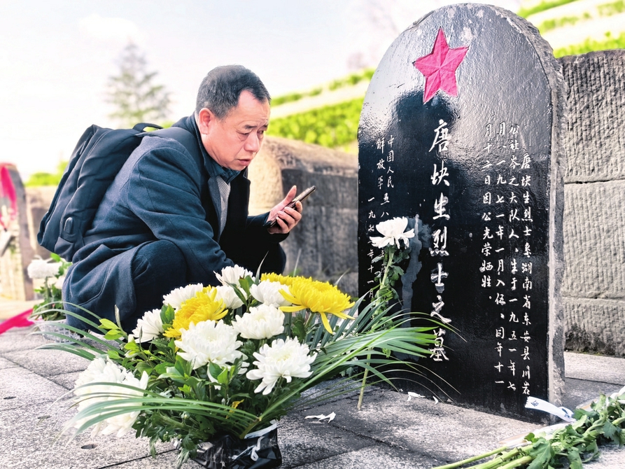 经过近30个小时的奔波,唐满生带着三哥唐菊生、侄儿唐盛赶到达州。在达州市退役军人事务局的帮助下,三人终于站到唐快生的墓碑前。墓碑上,“唐块生烈士之墓”几个字洒满阳光,灼得他们落下泪来。