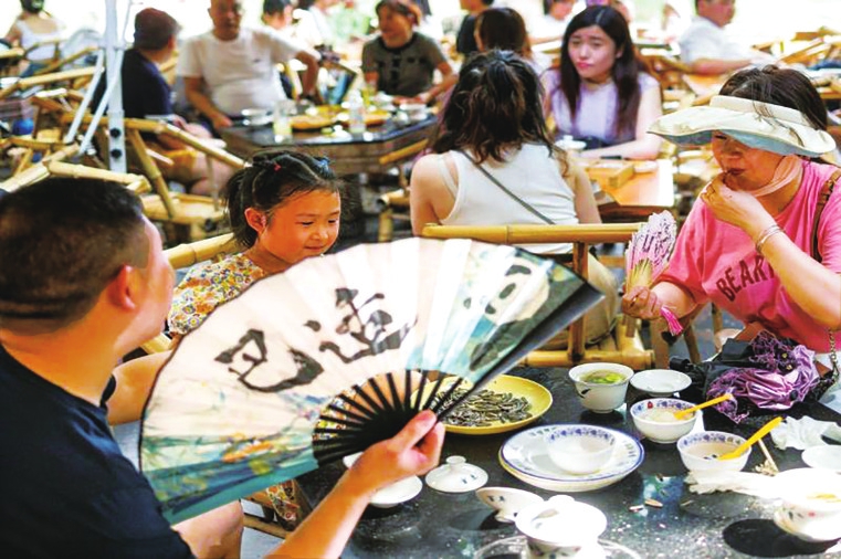 一家三口在成都人民公园鹤鸣茶社品茶。图据新华社客户端