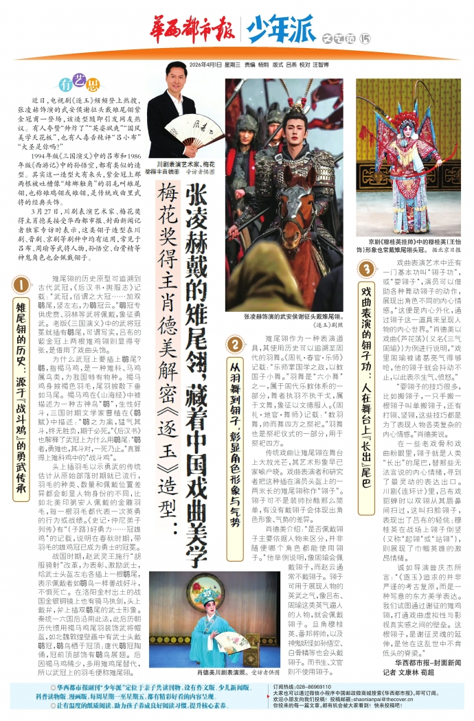 京剧《穆桂英挂帅》中的穆桂英(王怡饰)形象也常戴雉尾翎头冠。据北京日报