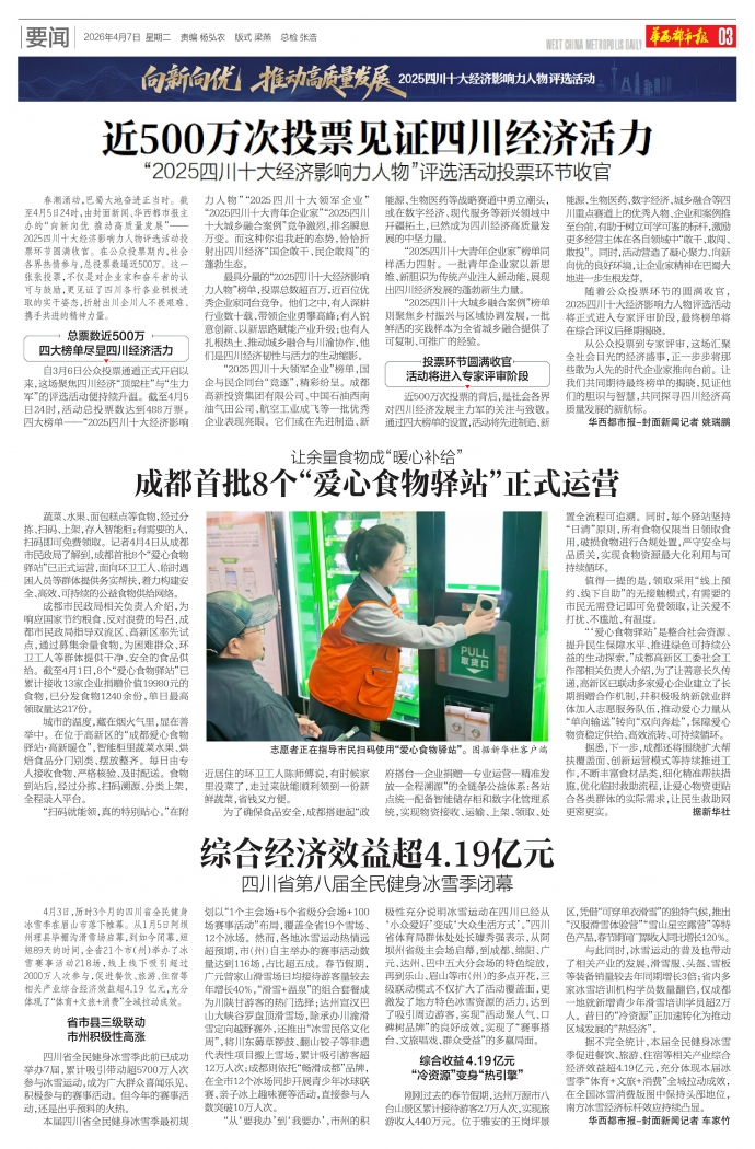 4月3日,历时3个月的四川省全民健身冰雪季在眉山市落下帷幕。从1月5日阿坝州理县毕棚沟滑雪场启幕,到如今闭幕,短短89天的时间,全省21个市(州)举办了冰雪赛事活动218场,线上线下吸引超过2000万人次参与,促进餐饮、旅游、住宿等相关产业综合经济效益超4.19 亿元,充分体现了“体育+文旅+消费”全域拉动成效。