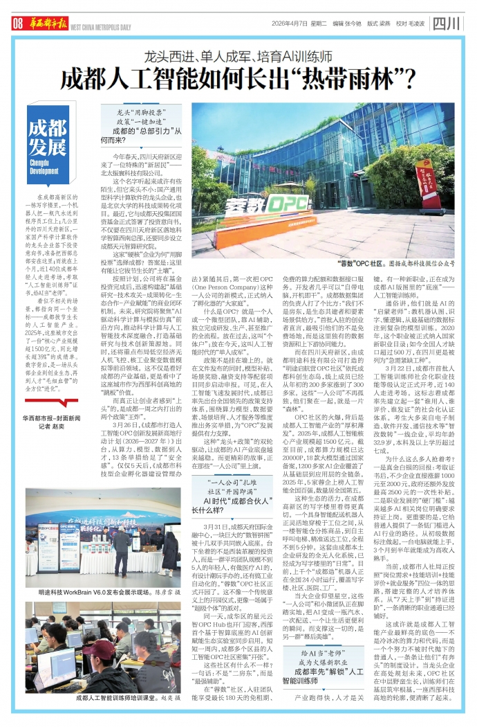 政策不是挂在墙上的。就在文件发布的同时,模型补贴、场景奖励、融资支持等配套项目同步启动申报。可见,在人工智能飞速发展时代,成都已率先出台全国领先的政策支持体系,围绕算力模型、数据要素、场景培育、人才服务等维度推出务实举措,为“OPC”发展提供有力支撑。