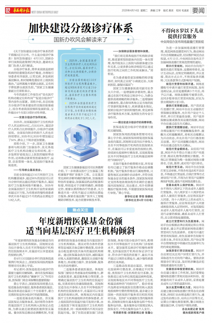 今年的政府工作报告对“优化医疗机构功能定位和布局”“促进分级诊疗”等内容作出部署。郑哲介绍,在总结地方分级诊疗体系建设的实践经验基础上,综合考虑我国国情和发展阶段,文件提出4个方面13项针对性举措。
