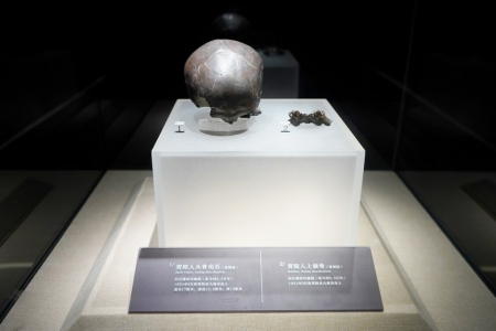 在资阳市博物馆“寻梦原乡”展厅,当地出土的“资阳人”头骨化石和上颌骨的复制品静静陈列。