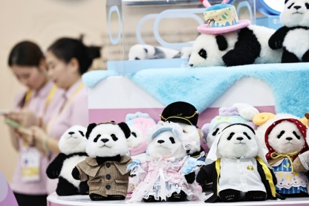 4月13日在第六届消博会四川展台拍摄的熊猫玩偶。新华社记者高静摄