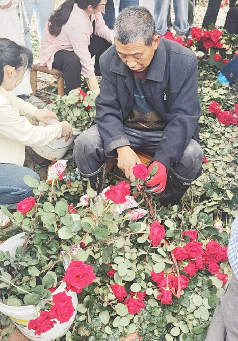 “玫瑰爷爷”帮游客修剪玫瑰。
