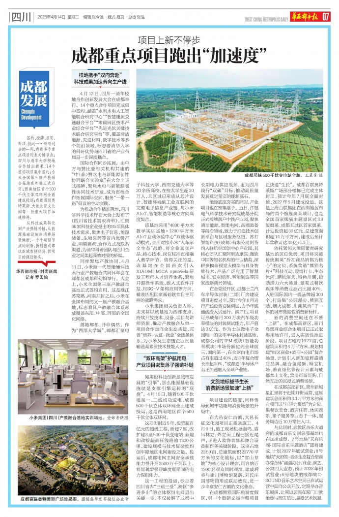 签约、授牌、启用、封顶、投运……刚刚过去的一周,成都多个重点项目迎来关键节点:四川与清华大学校地合作结出新果,14个前沿项目集中签约;小米全国第三座产教融合基地在郫都正式启用;西南地区首个500千伏立体双环网全面建成投运;成都百联奥特莱斯、大邑长征文化园等一批重大项目加速推进。