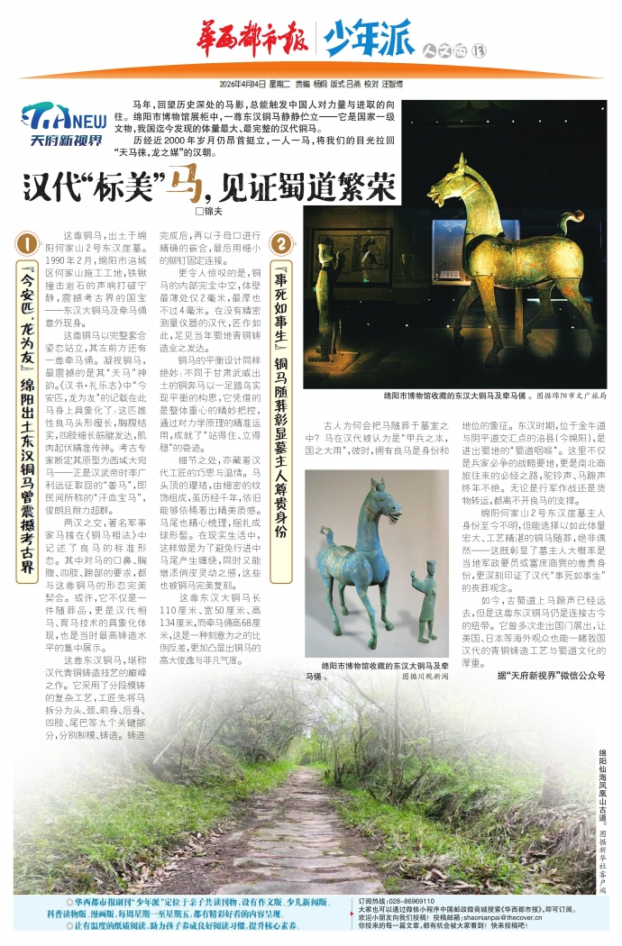 如今,古蜀道上马蹄声已经远去,但是这尊东汉铜马仍是连接古今的纽带。它曾多次走出国门展出,让美国、日本等海外观众也能一睹我国汉代的青铜铸造工艺与蜀道文化的厚重。