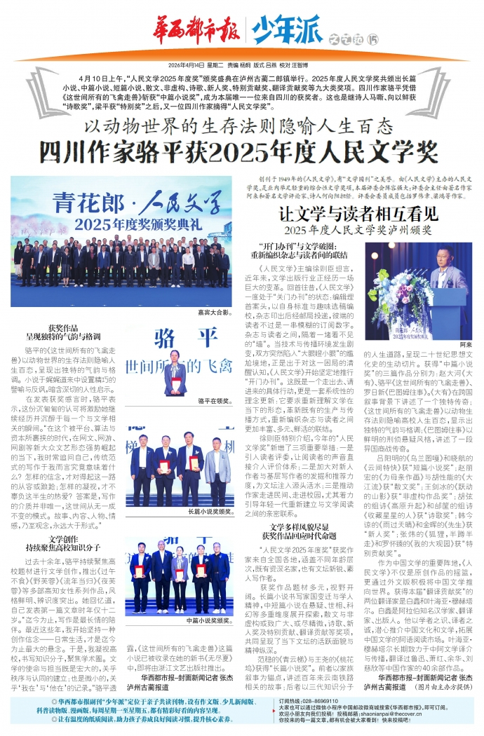 徐则臣特别介绍,今年的“人民文学奖”新增了三项重要举措:一是引入读者评委,让阅读者的声音直接介入评价体系;二是加大对新人作者与基层写作者的发掘和推荐力度,为文坛注入源头活水;三是推动作家走进民间、走进校园,尤其着力引导年轻一代重新建立与文学阅读之间的亲密联系。