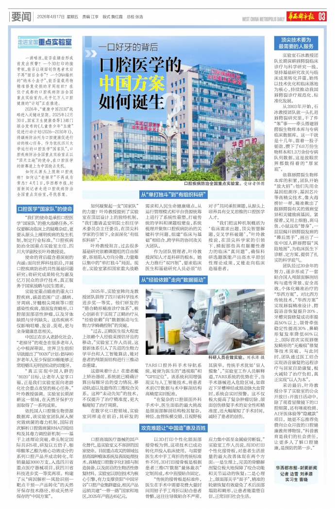 如何从源头上阻断口腔疾病?如何让“老掉牙”不再成为常态?4月1日,华西都市报、封面新闻记者走进口腔疾病防治全国重点实验室,寻找答案。