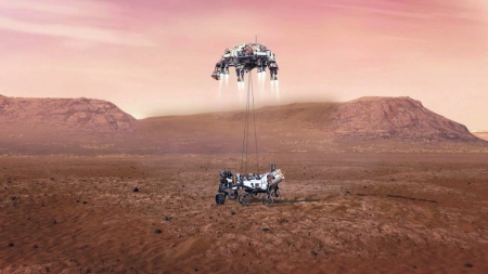 这张示意图显示美国“毅力”号火星车在火星着陆的过程。2021年2月18日,美国“毅力”号火星车在火星成功着陆。