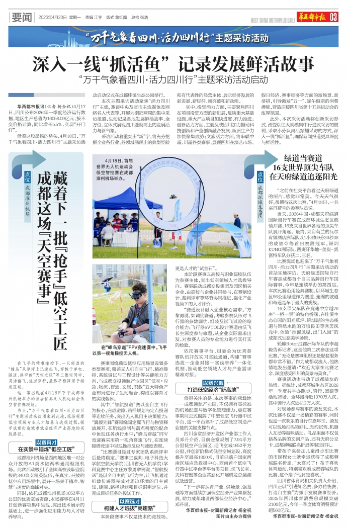 其中,投资活力方面,主要聚焦四川在项目投资方面的新进展,反映重大基础设施、重大产业项目加快进度、有力推进;创新活力方面,主要反映四川加力推动科技创新和产业创新融合发展、新质生产力加快聚集成势;文旅活力方面,将串联中超、川超各类赛事,展现四川在演艺市场、假日经济、赛事经济等方面的新场景、新举措,引导激发“五一”、端午假期的消费潜能,营造迎接四川省第十五届运动会的浓厚氛围。