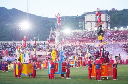 赛前,大型开场舞《锦绣盛世》震撼登场,200名演员手持战旗,复刻磅礴的賨人群像,尽显古賨国的豪迈风骨;300名“黄花仙女”翩跹起舞,将渠县的千年风雅与好客初心凝聚于舞台。更令人瞩目的是,创新改版的50座国家级非物质文化遗产“三汇彩亭”惊艳亮相。舞者以“晃、转、摆”的精妙身姿,将千年匠思与非遗底蕴展现得淋漓尽致。同时,400名演员带来的武术、英歌舞、舞狮、彩带龙等多元演绎,生动彰显了达州民俗文化的独特魅力。中场休息时段,表演将气氛推向新的高潮。渠县籍军旅歌手徐佳登场,唱响深情礼赞家乡的《织梦巴山》,300名舞者伴舞,氛围感拉满。