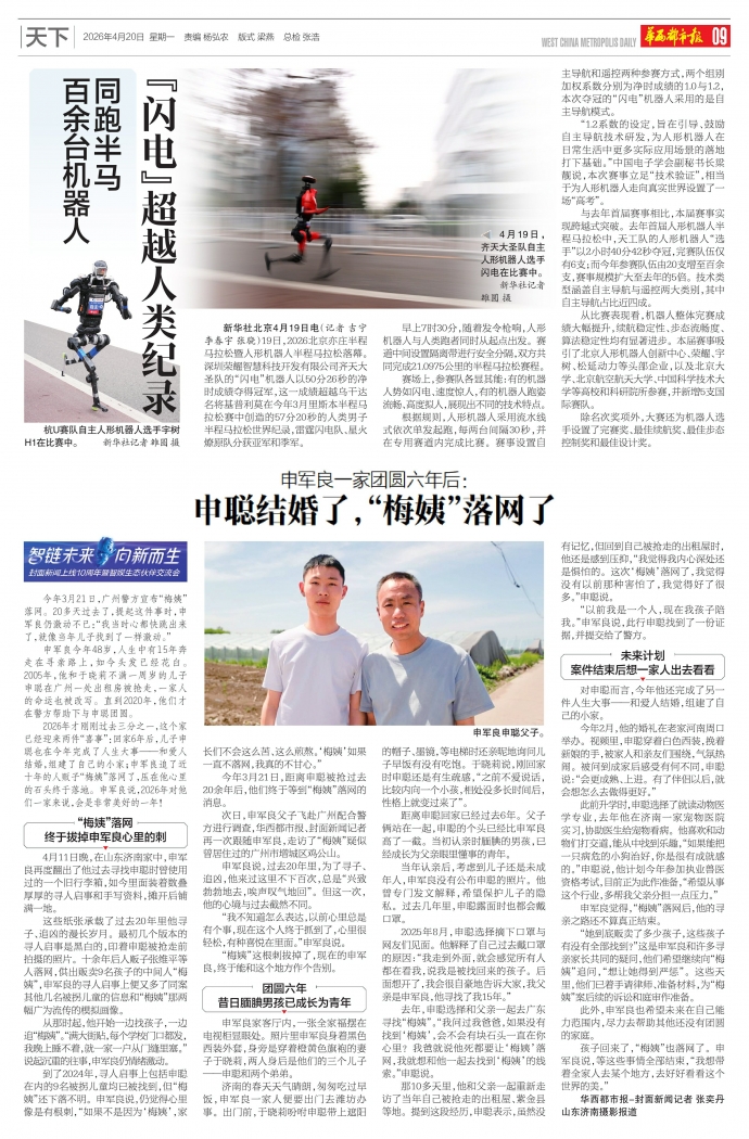 新华社北京4月19日电(记者吉宁李春宇张骁)19日,2026北京亦庄半程马拉松暨人形机器人半程马拉松落幕。深圳荣耀智慧科技开发有限公司齐天大圣队的“闪电”机器人以50分26秒的净时成绩夺得冠军,这一成绩超越乌干达名将基普利莫在今年3月里斯本半程马拉松赛中创造的57分20秒的人类男子半程马拉松世界纪录,雷霆闪电队、星火燎原队分获亚军和季军。