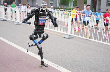 4月19日,齐天大圣队自主人形机器人选手闪电在比赛中。