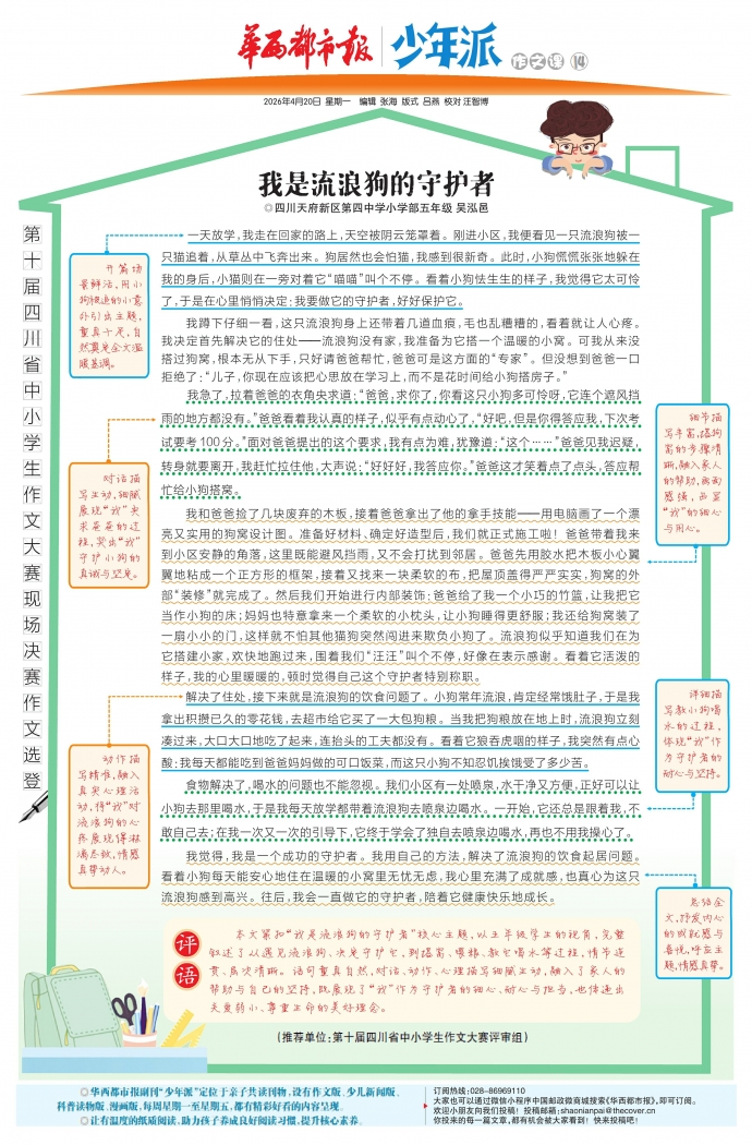 本文紧扣“我是流浪狗的守护者”核心主题,以五年级学生的视角,完整叙述了从遇见流浪狗、决定守护它,到搭窝、喂粮、教它喝水等过程,情节连贯、层次清晰。语句童真自然,对话、动作、心理描写细腻生动,融入了家人的帮助与自己的坚持,既展现了“我”作为守护者的细心、耐心与担当,也传递出关爱弱小、尊重生命的美好理念。