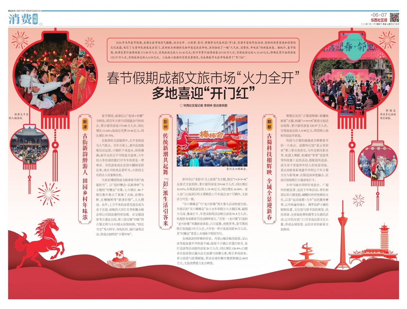 2026年马年春节假期,成都文旅市场热气腾腾,活力全开。以新津、彭州、郫都等为代表的区(市)县,凭借丰富的年俗活动、创新的场景营造和深厚的文化底蕴,吸引了大量市民游客走出家门,在传统与新潮的交融中感受浓浓年味,共同绘就了一幅“人气旺、消费热、年味浓”的新春画卷。据统计,春节假期,新津区累计接待游客173.88万人次,实现旅游总收入10.46亿元;彭州市累计接待游客219.08万人次,实现旅游总收入15.45亿元;郫都区累计接待游客125.97万人次,实现旅游总收入8.58亿元。三地核心数据均实现显著增长,为成都春节文旅市场赢得了“开门红”。