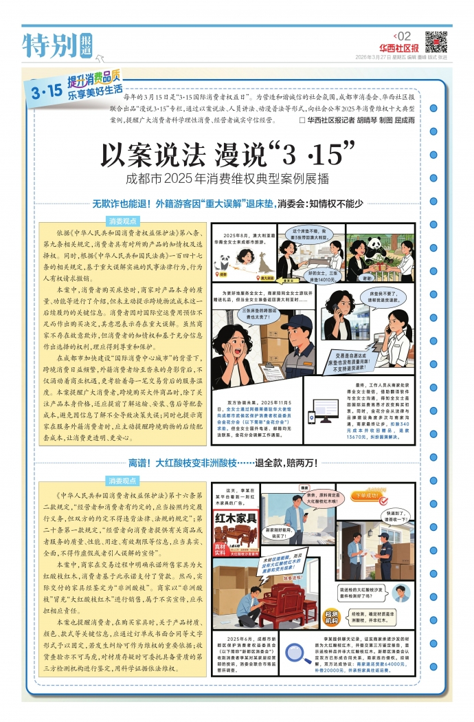 每年的3月15日是“3·15国际消费者权益日”。为营造和谐诚信的社会氛围,成都市消委会、华西社区报联合出品“漫说3·15”专栏,通过以案说法、人员讲法、动漫普法等形式,向社会公布2025年消费维权十大典型案例,提醒广大消费者科学理性消费、经营者诚实守信经营。