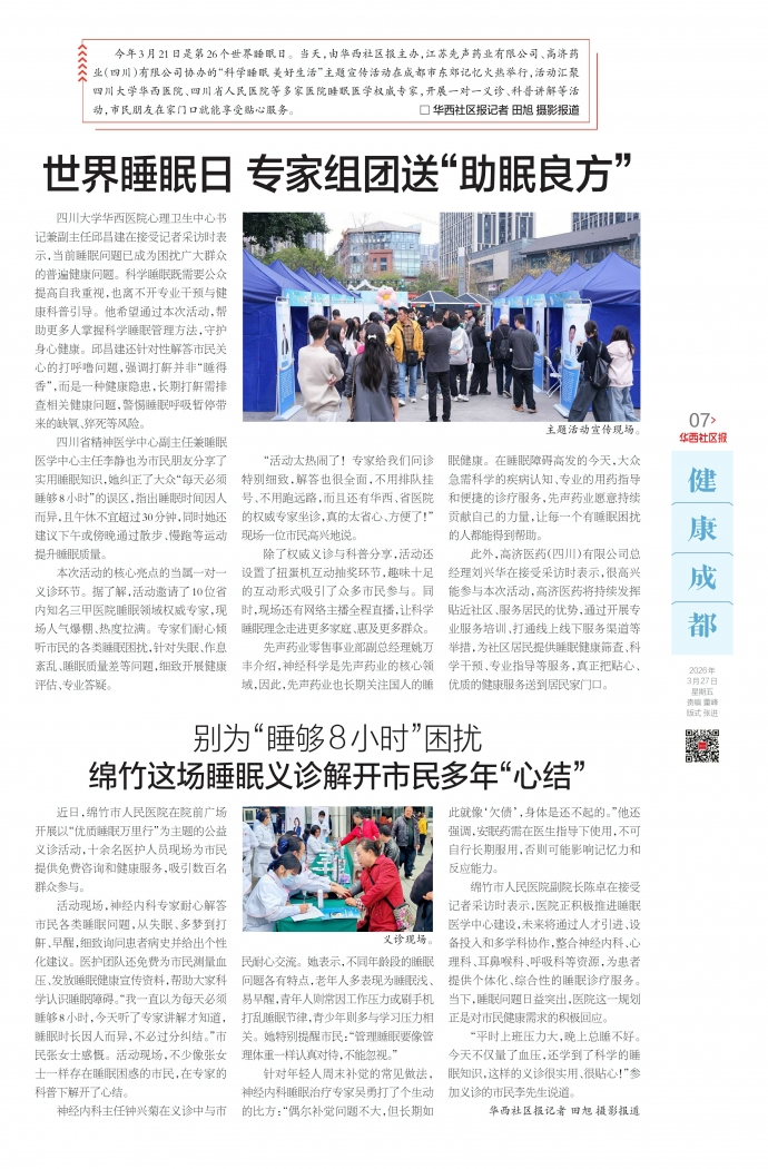 今年3月21日是第26个世界睡眠日。当天,由华西社区报主办,江苏先声药业有限公司、高济药业(四川)有限公司协办的“科学睡眠美好生活”主题宣传活动在成都市东郊记忆火热举行,活动汇聚四川大学华西医院、四川省人民医院等多家医院睡眠医学权威专家,开展一对一义诊、科普讲解等活动,市民朋友在家门口就能享受贴心服务。