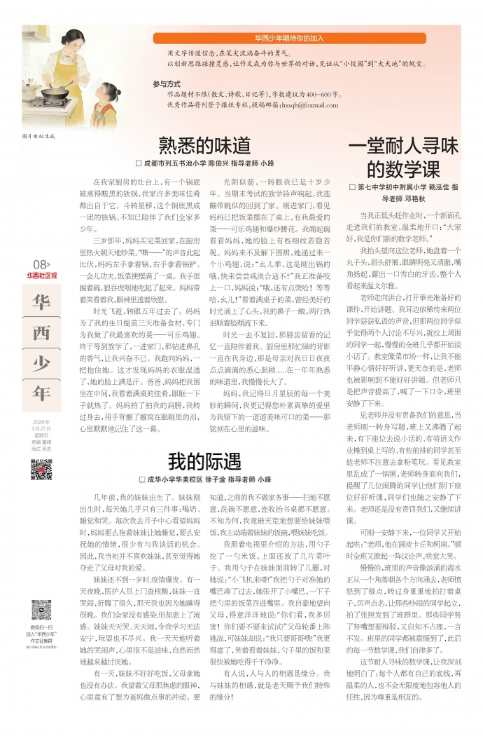 作品题材不限(散文、诗歌、日记等),字数建议为400-600字。优秀作品将刊登于报纸专栏,投稿邮箱:hxsqb@foxmail.com