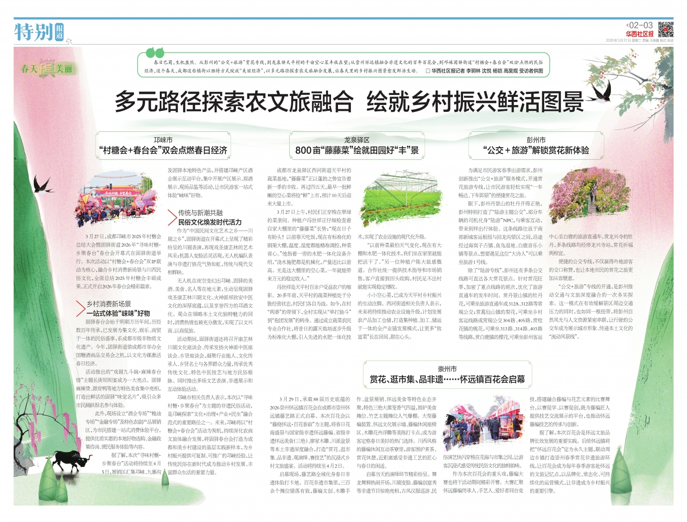 春日巴蜀,生机盎然。从彭州的“公交+旅游”赏花专线,到龙泉驿天平村的千亩空心菜丰收在望;从崇州怀远镇融合非遗文化的百年百花会,到邛崃固驿街道“村糖会+春台会”双IP点燃的民俗经济,这个春天,成都这些镇街以独特方式绽放“美丽经济”,以多元路径探索农文旅融合发展,让春天里的乡村振兴图景愈发鲜活生动。