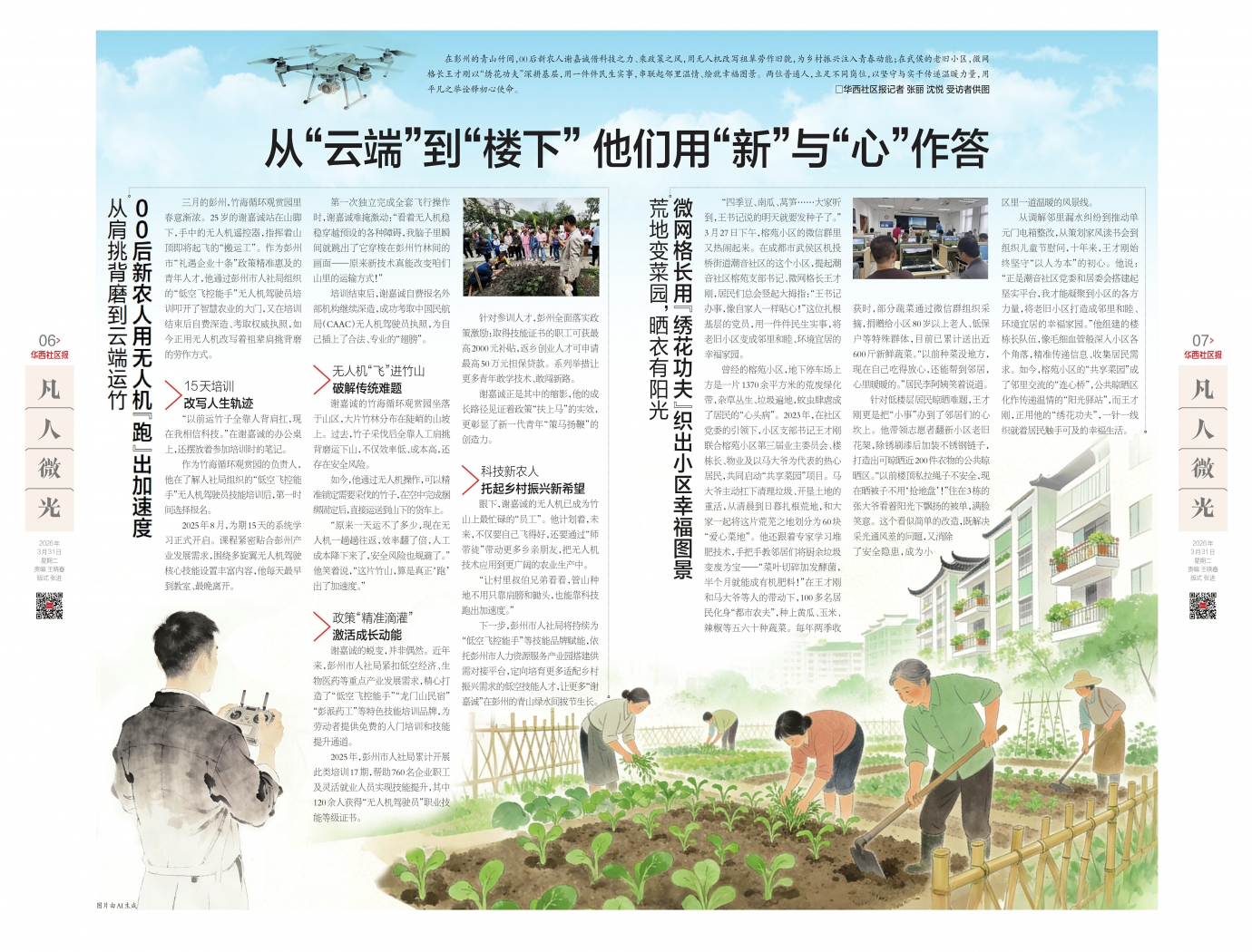 在彭州的青山竹间,00后新农人谢嘉诚借科技之力、乘政策之风,用无人机改写祖辈劳作旧貌,为乡村振兴注入青春动能;在武侯的老旧小区,微网格长王才刚以“绣花功夫”深耕基层,用一件件民生实事,串联起邻里温情、绘就幸福图景。两位普通人,立足不同岗位,以坚守与实干传递温暖力量,用平凡之举诠释初心使命。