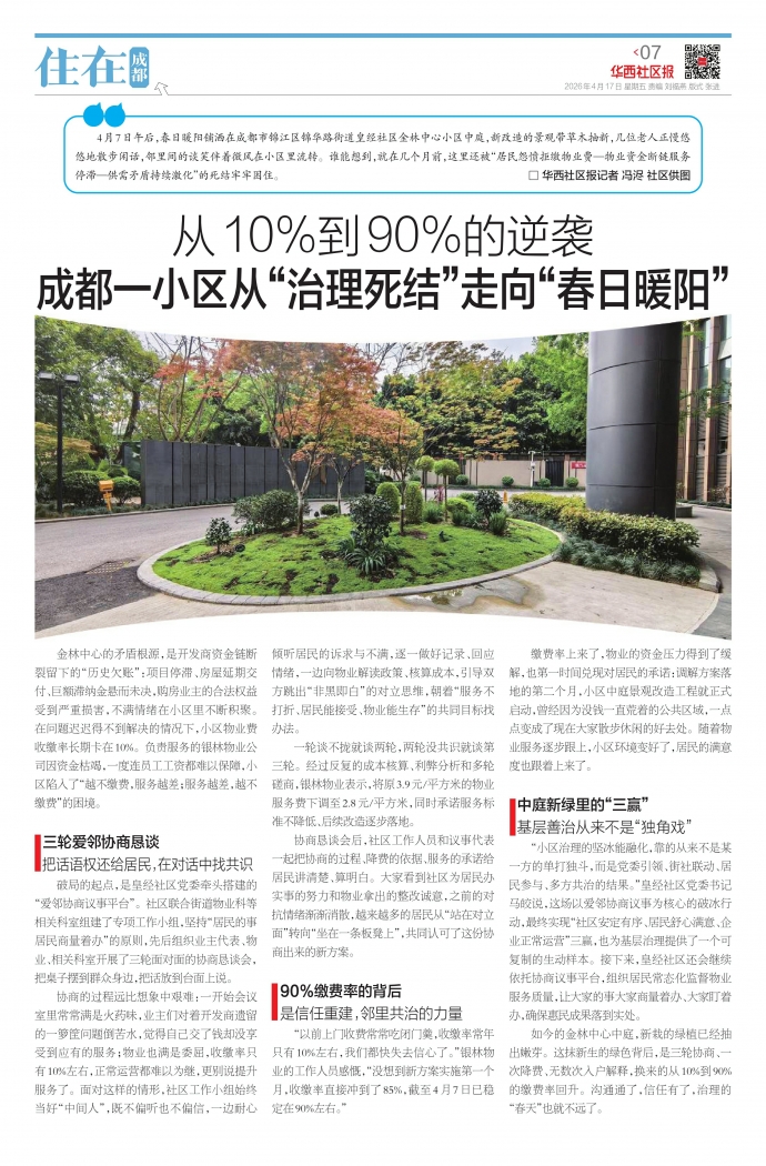 如今的金林中心中庭,新栽的绿植已经抽出嫩芽。这抹新生的绿色背后,是三轮协商、一次降费、无数次入户解释,换来的从10%到90%的缴费率回升。沟通通了,信任有了,治理的“春天”也就不远了。