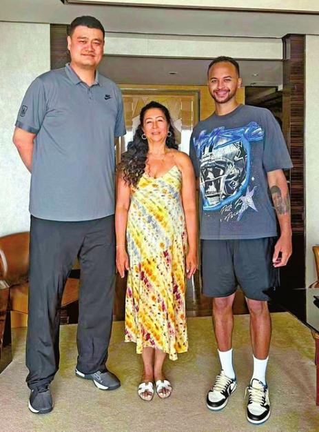 中 国篮协主席姚明与李凯尔(右)及其母亲合影。 图据中国篮协官方微博
