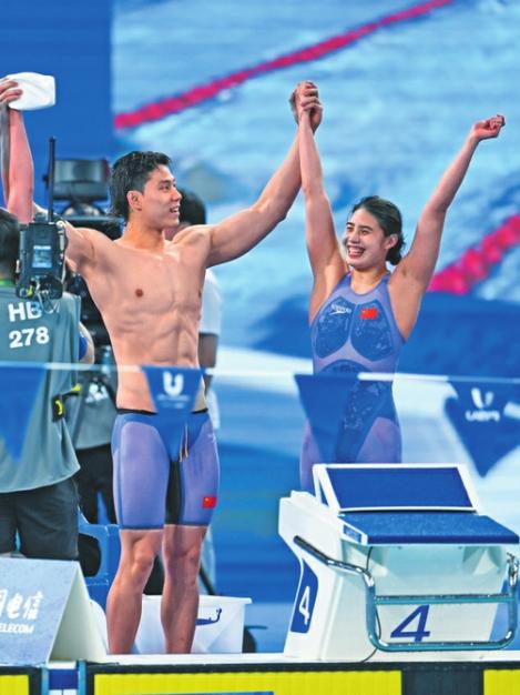 在8月2日进行的成都大运会游泳比赛中,“蝶后”张雨霏、“蛙王”覃海洋接连亮相个人和接力项目,带领中国队一晚摘得四金,东安湖体育公园游泳跳水馆里欢呼声震天。