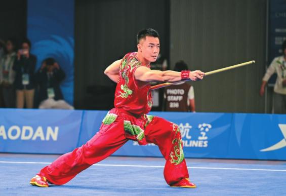 曹茂园在成都大运会男子南棍比赛中。 杨涛摄