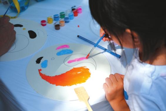 游客在为扇子上的金熊猫奖标识填色。