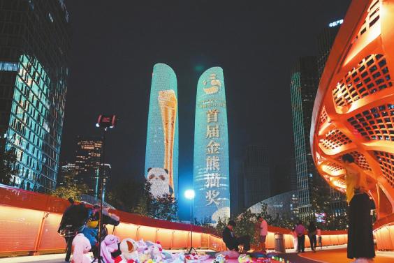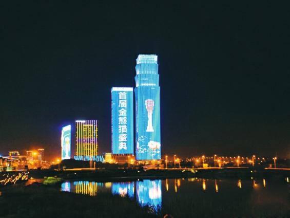 天府国际会议中心周边楼宇打出“首届金熊猫奖”标识等。 图据川观新闻